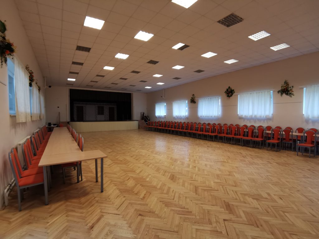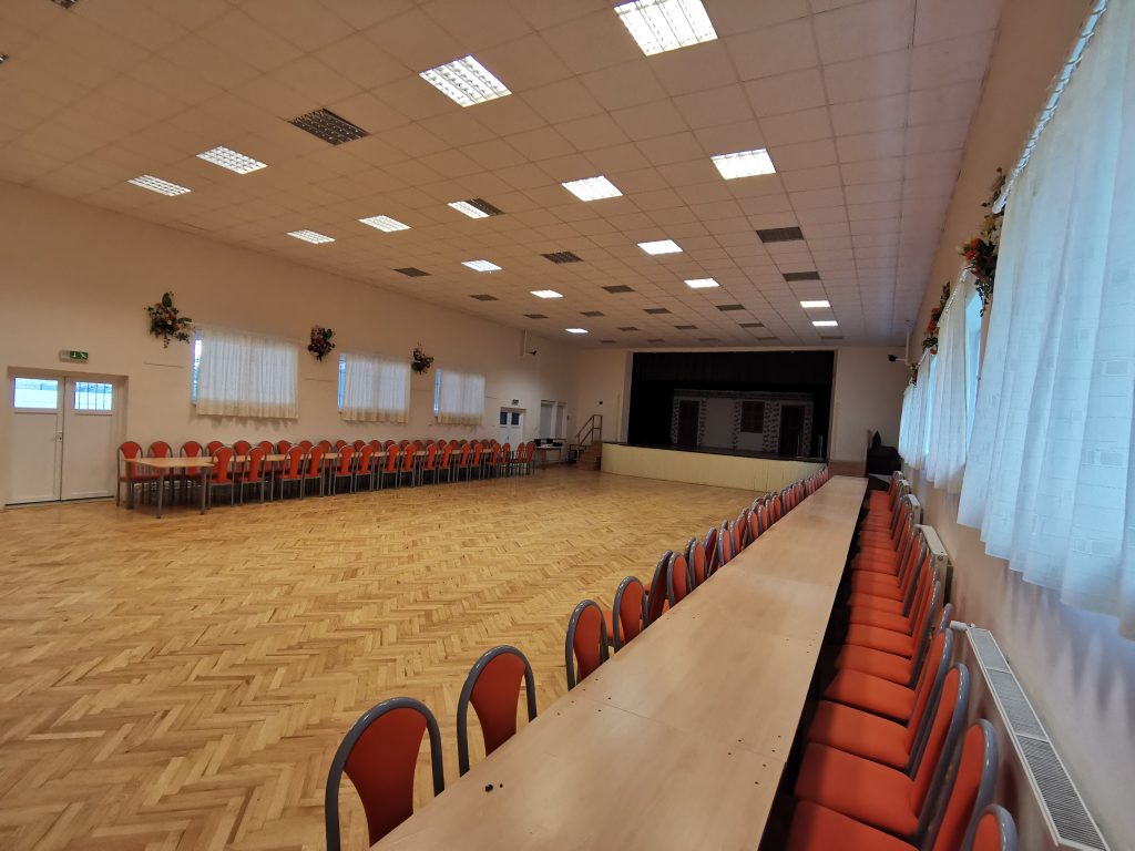Spoločenská sála – kapacita 140 miest, javisko so zázemím pre účinkujúcich, základné osvetlenie, bez ozvučenia